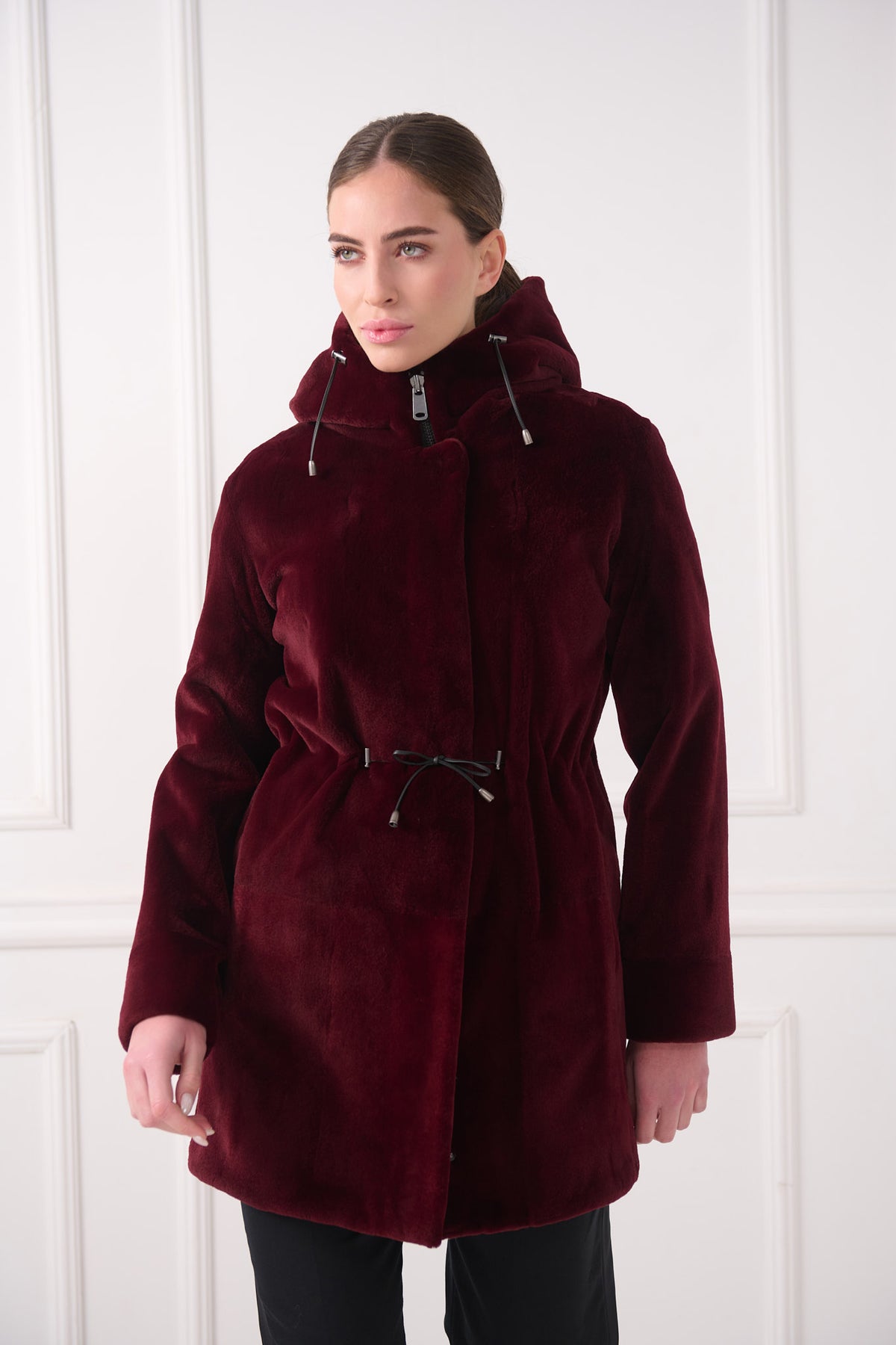 Elegant hooded mink jacket, designed with a clean, modern silhouette. The straight cut is balanced by refined functional details, giving the piece an effortless sense of luxury. Leather drawstrings at the hood and waist allow the fit to be adjusted, while a back slit with leather drawstring at the lower hem adds comfort and ease of movement. The front closes with a concealed zipper and padded snap buttons.