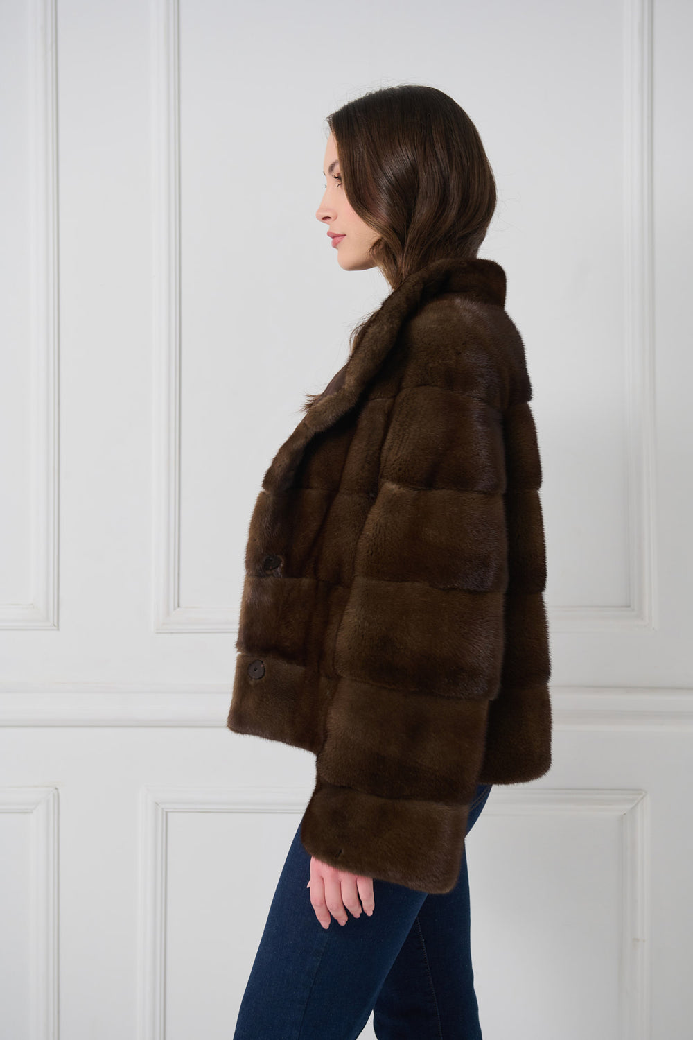 Legere, schicke Wendejacke mit Stehkragen. Eine Seite besteht aus luxuriöser Mink, während die andere Seite und die Kapuze aus 100% wasserdichtem Polyester-Daunenfutter gefertigt sind und stilvolle Mink-Umklappbündchen aufweisen.