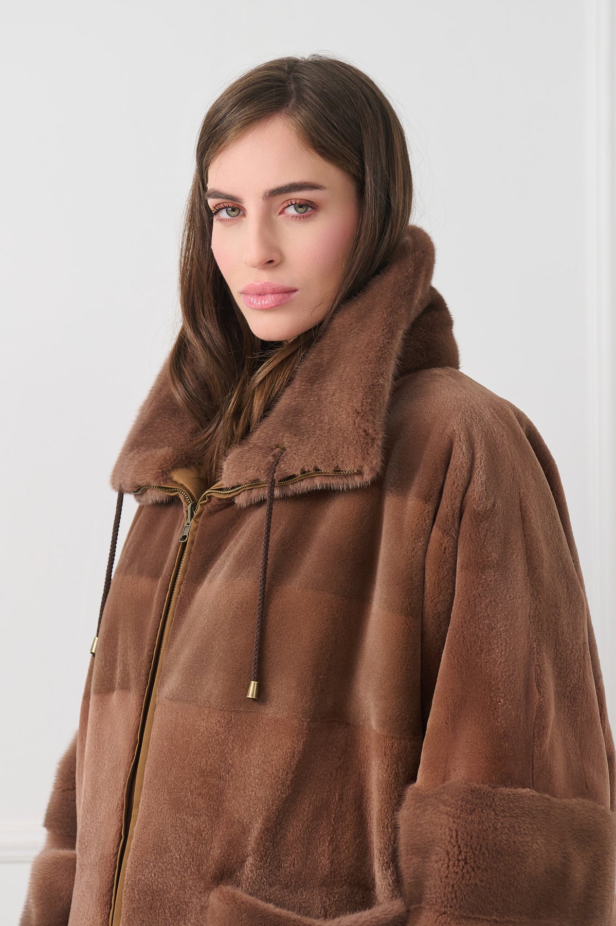Veste confortable offrant polyvalence grâce à sa construction réversible. Un côté présente un corps en vison doucement tondu, tandis que l'envers est en tissu et met subtilement en valeur les détails du vison. Un col, des poignets et des poches en vison à poil long ajoutent richesse et texture, restant visibles même lorsqu'ils sont portés du côté tissu.