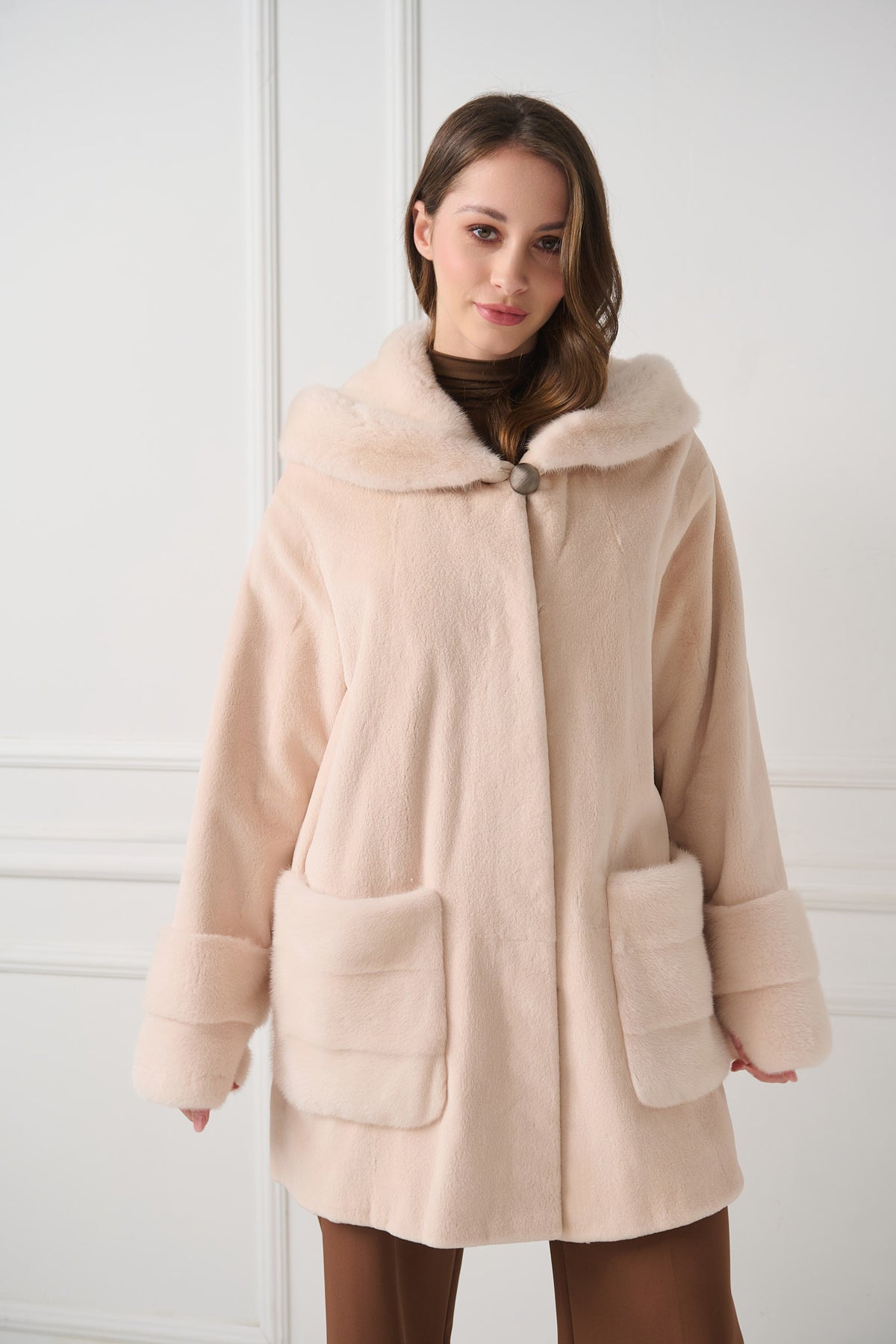 Manteau élégant confectionné en vison tondu. Les lignes épurées sont rehaussées par une généreuse capuche en longs poils de vison, apportant chaleur et un contraste doux et luxueux. Des détails assortis en longs poils de vison finissent les poches plaquées et les poignets, donnant à la pièce un aspect riche mais équilibré. Le devant se ferme par une fermeture dissimulée, complétée par un bouton bijou décoratif en partie supérieure pour un accent subtil.