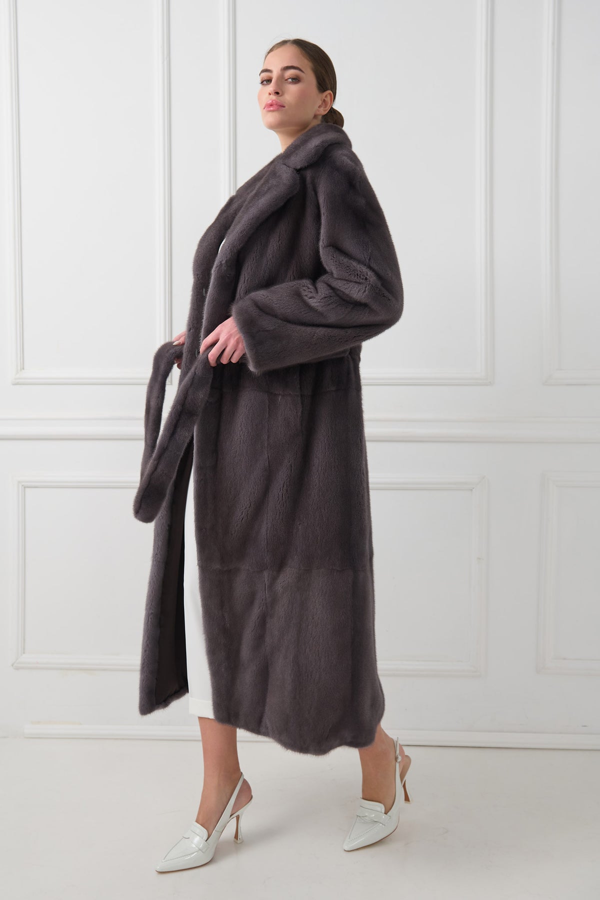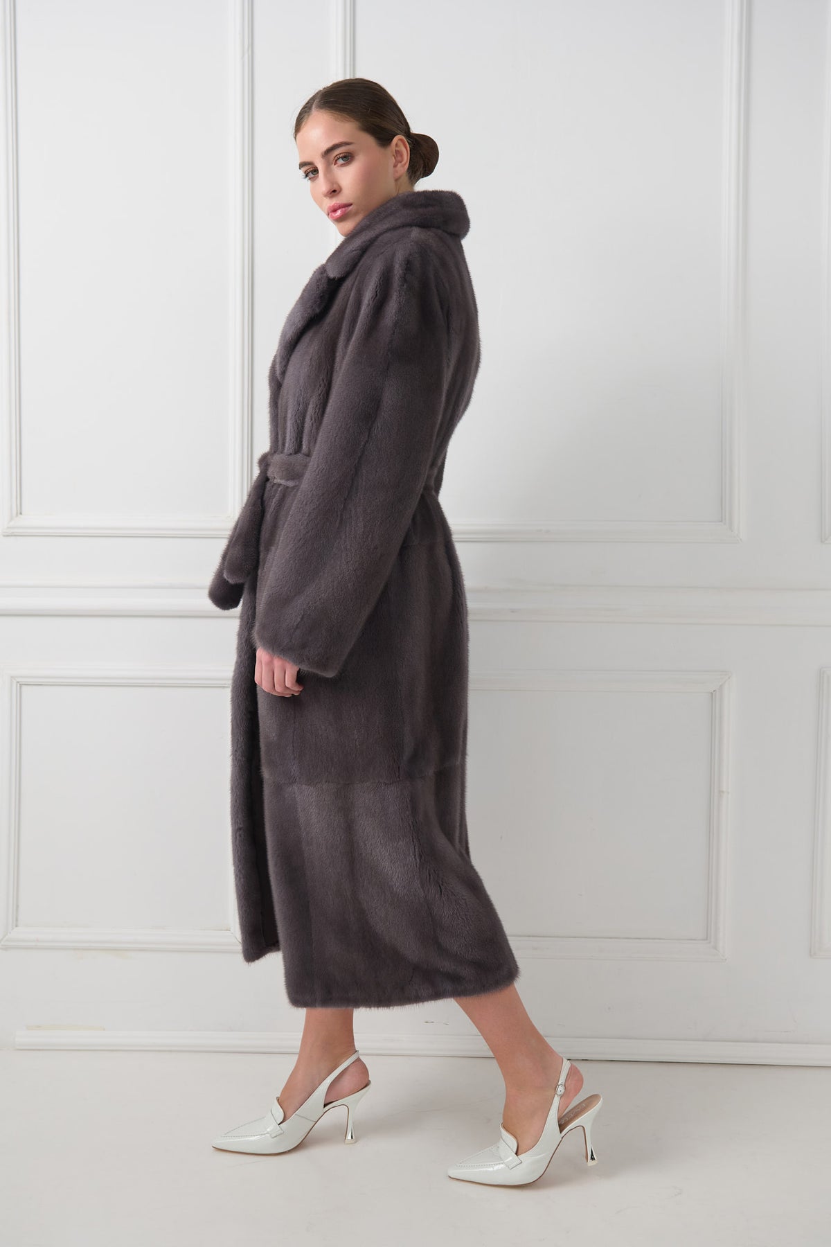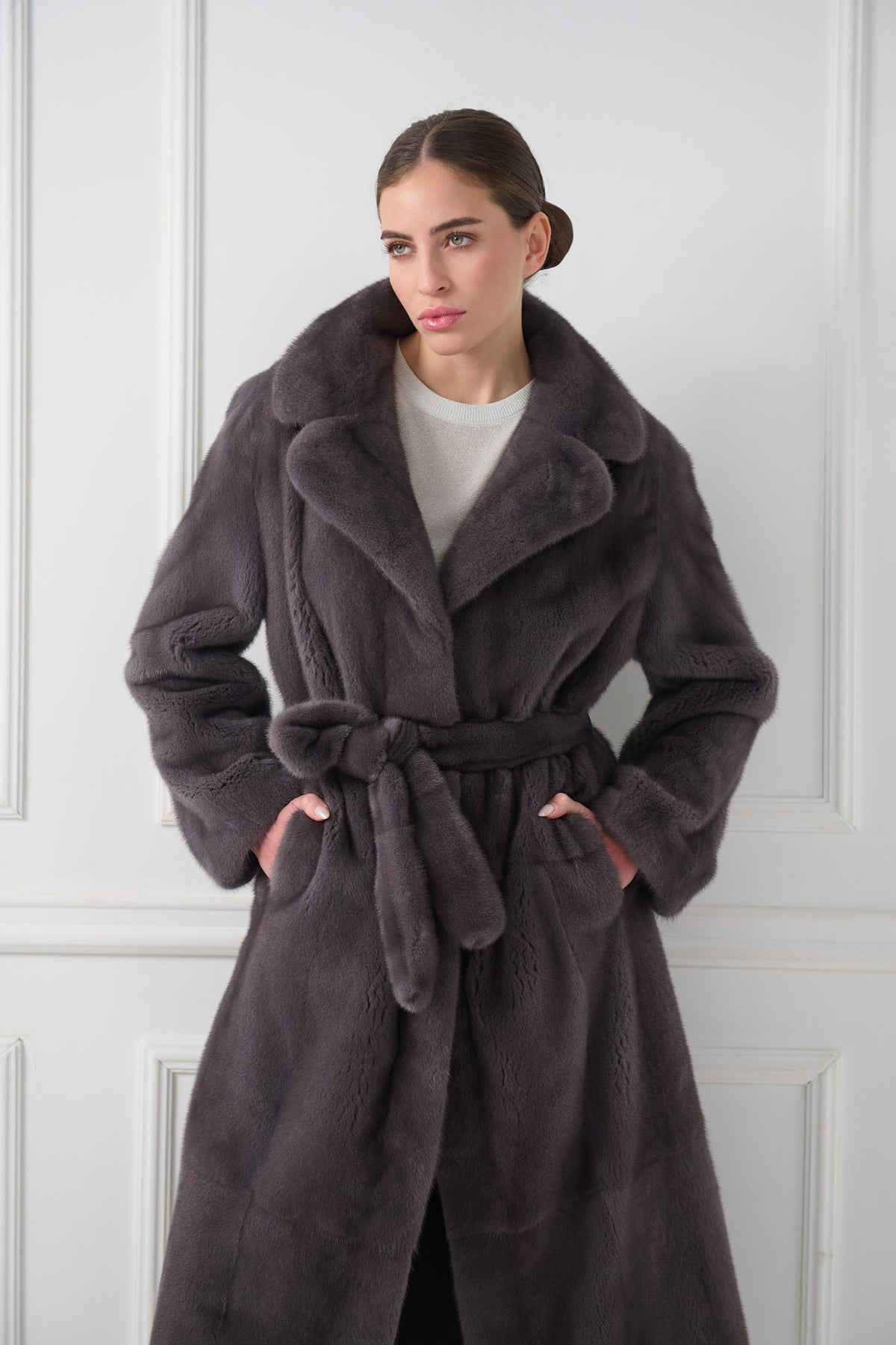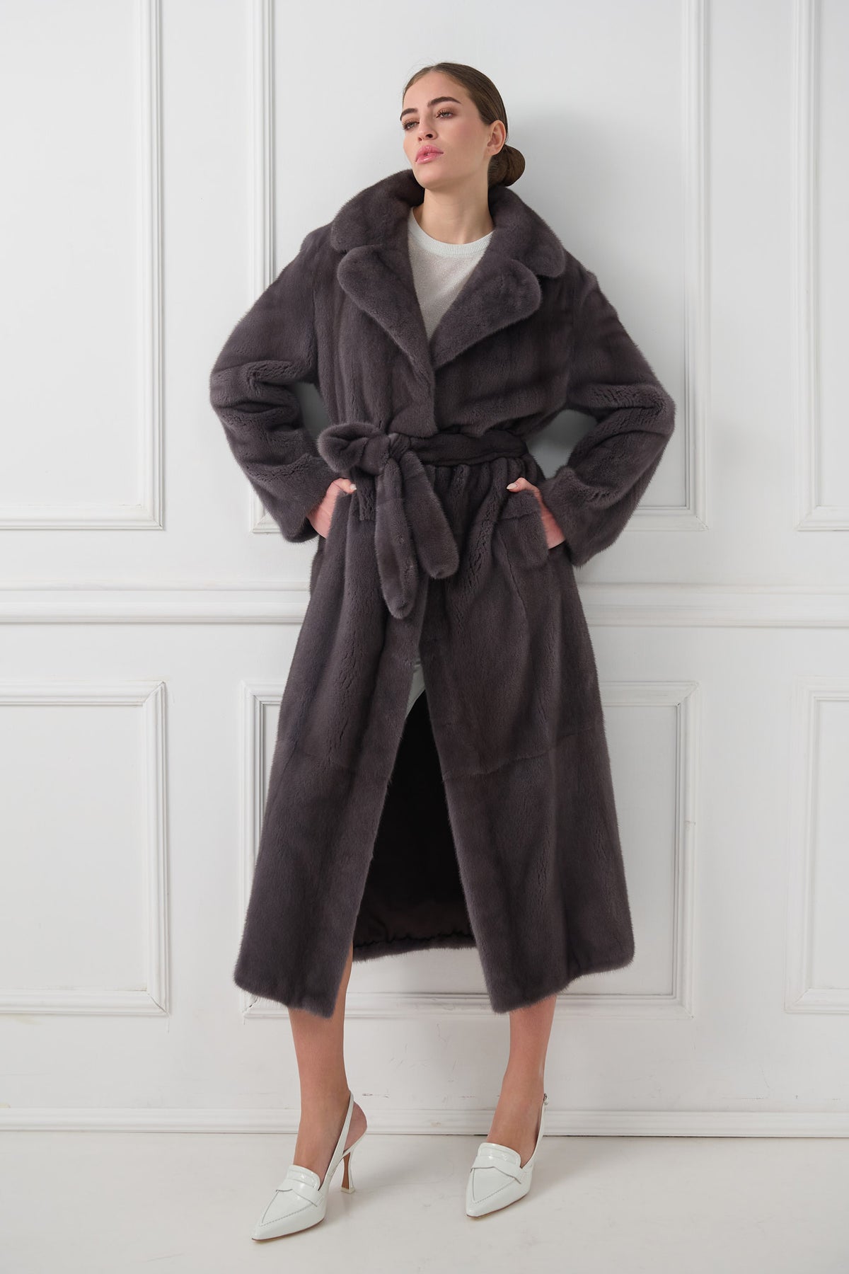 Cappotto in visone raffinato e femminile progettato con una silhouette elegante. Realizzato in visone lussuoso e morbido, il cappotto si distingue per la sua superficie pulita e il drappeggio fluido, offrendo un look senza tempo ed elegante. Un morbido colletto a scialle incornicia la scollatura, mentre la cintura in visone abbinata definisce delicatamente la vita, permettendo di regolare la vestibilità per un aspetto più su misura o rilassato.
