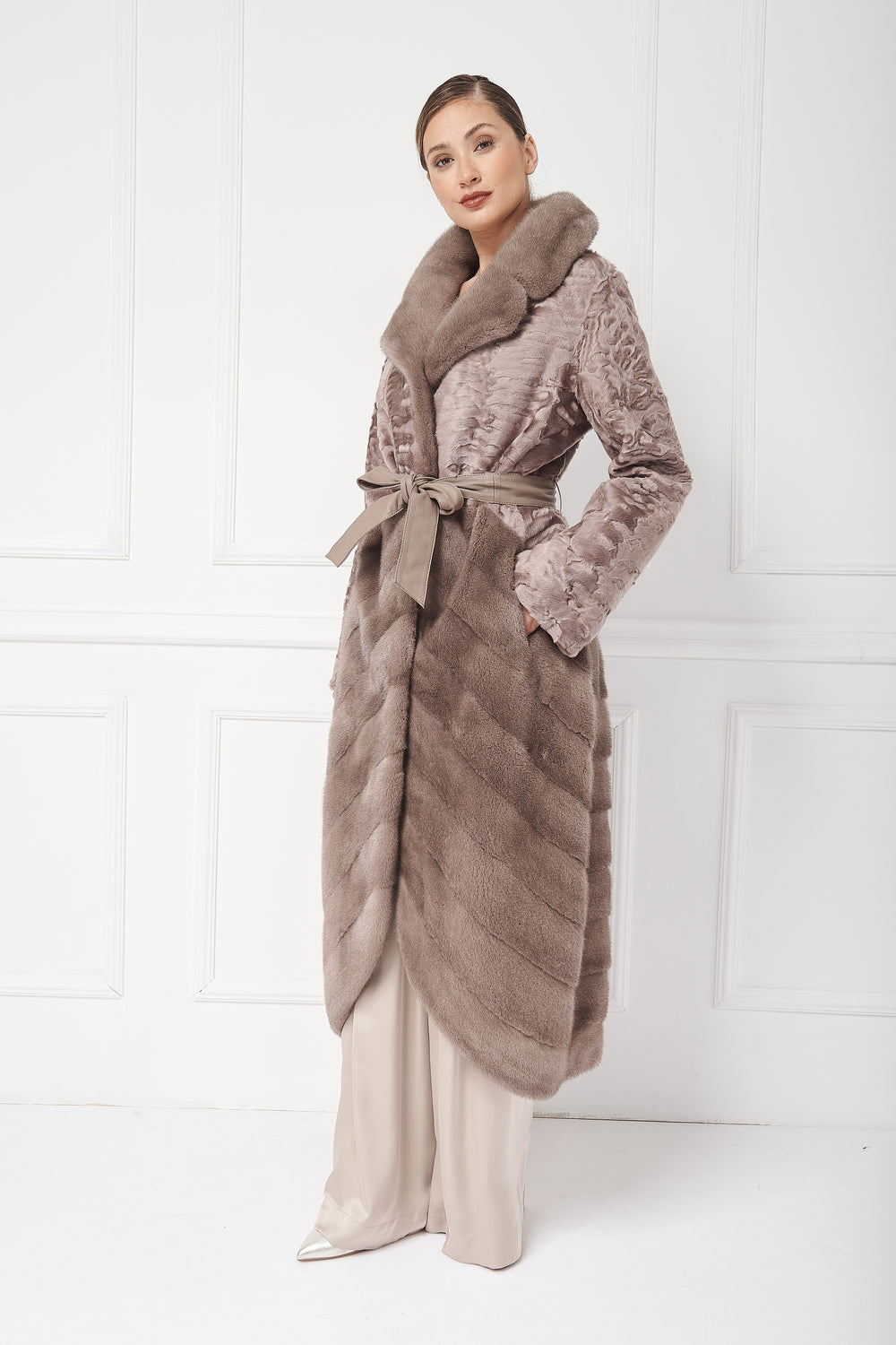 Изысканная длинная шуба из персидской овчины и норки